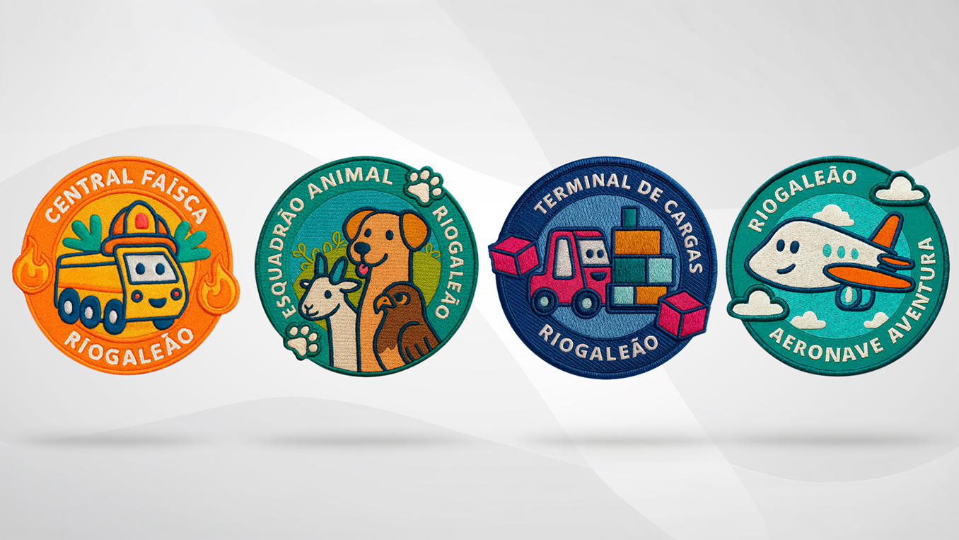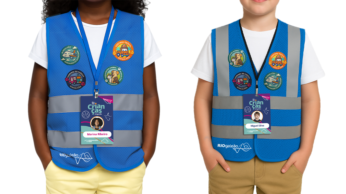 Um dos principais pontos do projeto foi a ressignificação do colete de acesso ao pátio das aeronaves. Além de item obrigatório de segurança, ele passou a funcionar como parte da dinâmica da experiência: durante a visita, as crianças recebiam insígnias colecionáveis referentes a cada área explorada.