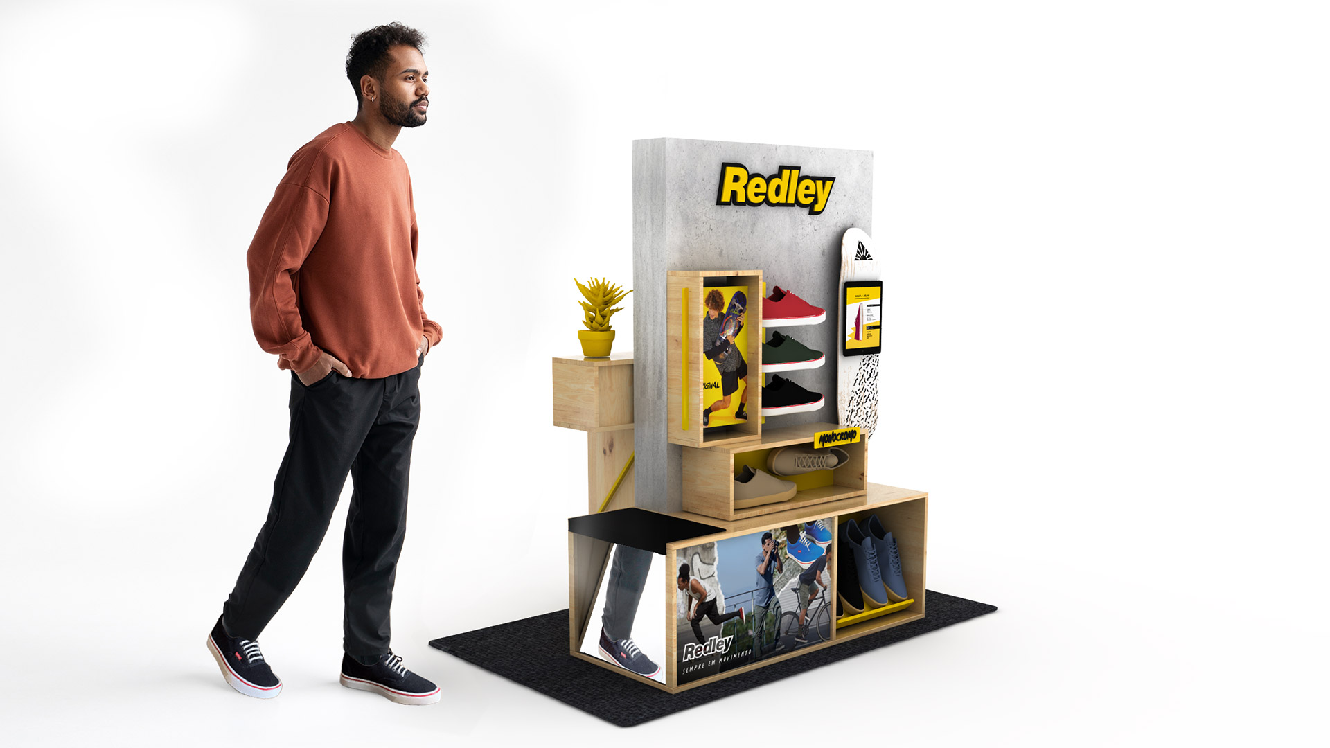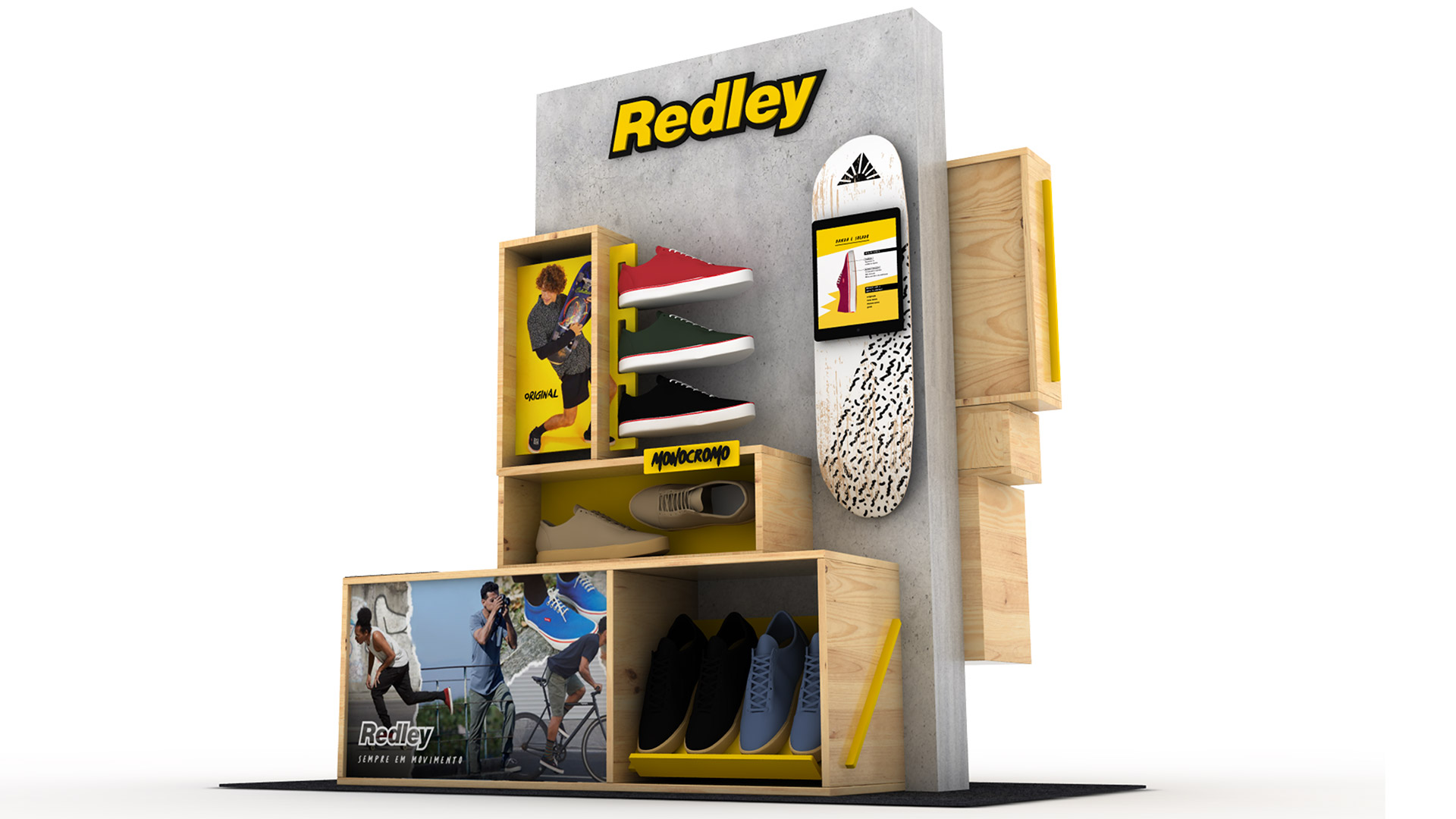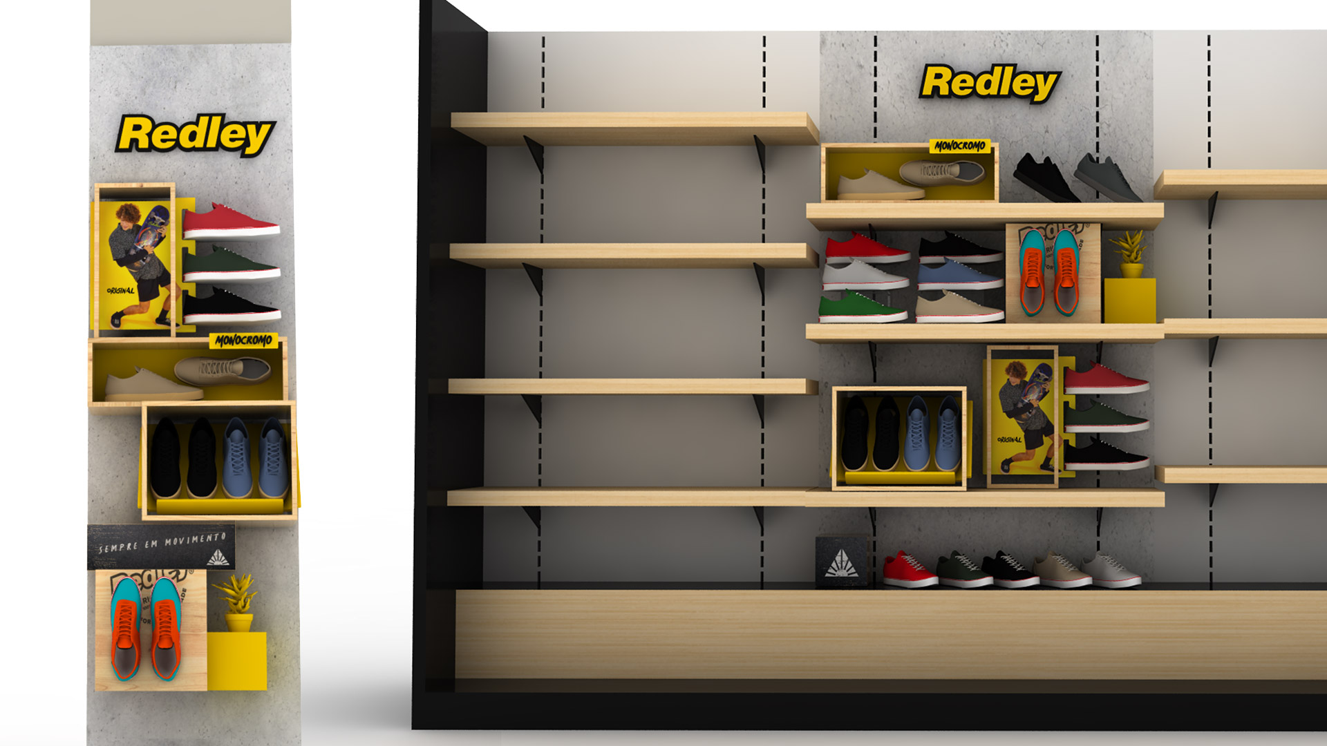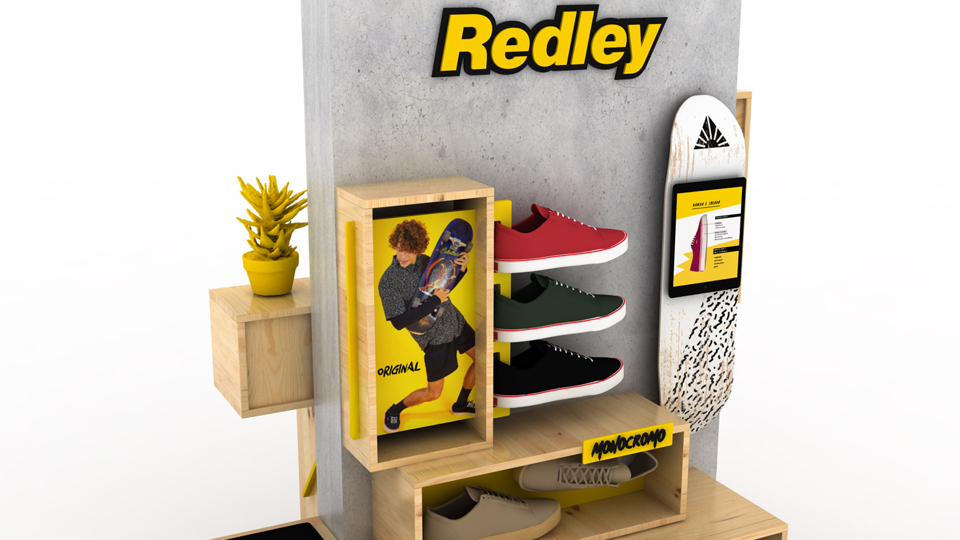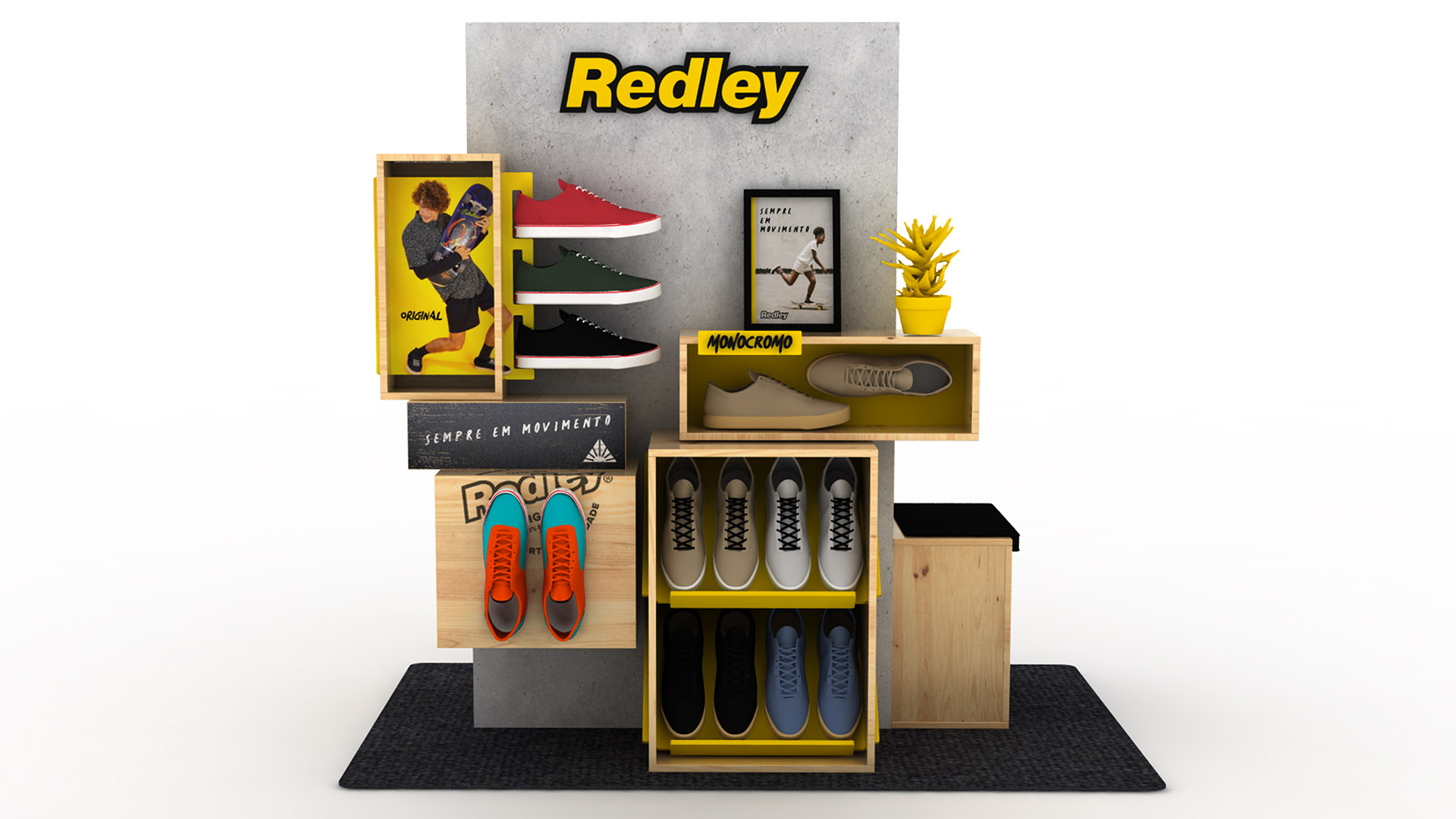 Desenvolvemos uma solução store in store completa para a Redley: display ilha, ativação de pilastra e vitrine que trabalham de forma integrada para criar presença marcante em varejos multimarcas.