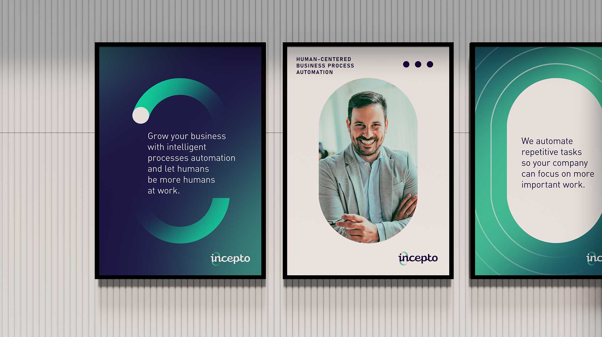 O desafio era traduzir visualmente os pilares da empresa — agilidade, tecnologia, qualidade, inovação e transformação — em identidade que comunicasse eficiência e modernidade. A solução reflete o compromisso da Incepto com aprimoramento contínuo de suas soluções e o impacto transformador da automação nos processos empresariais.