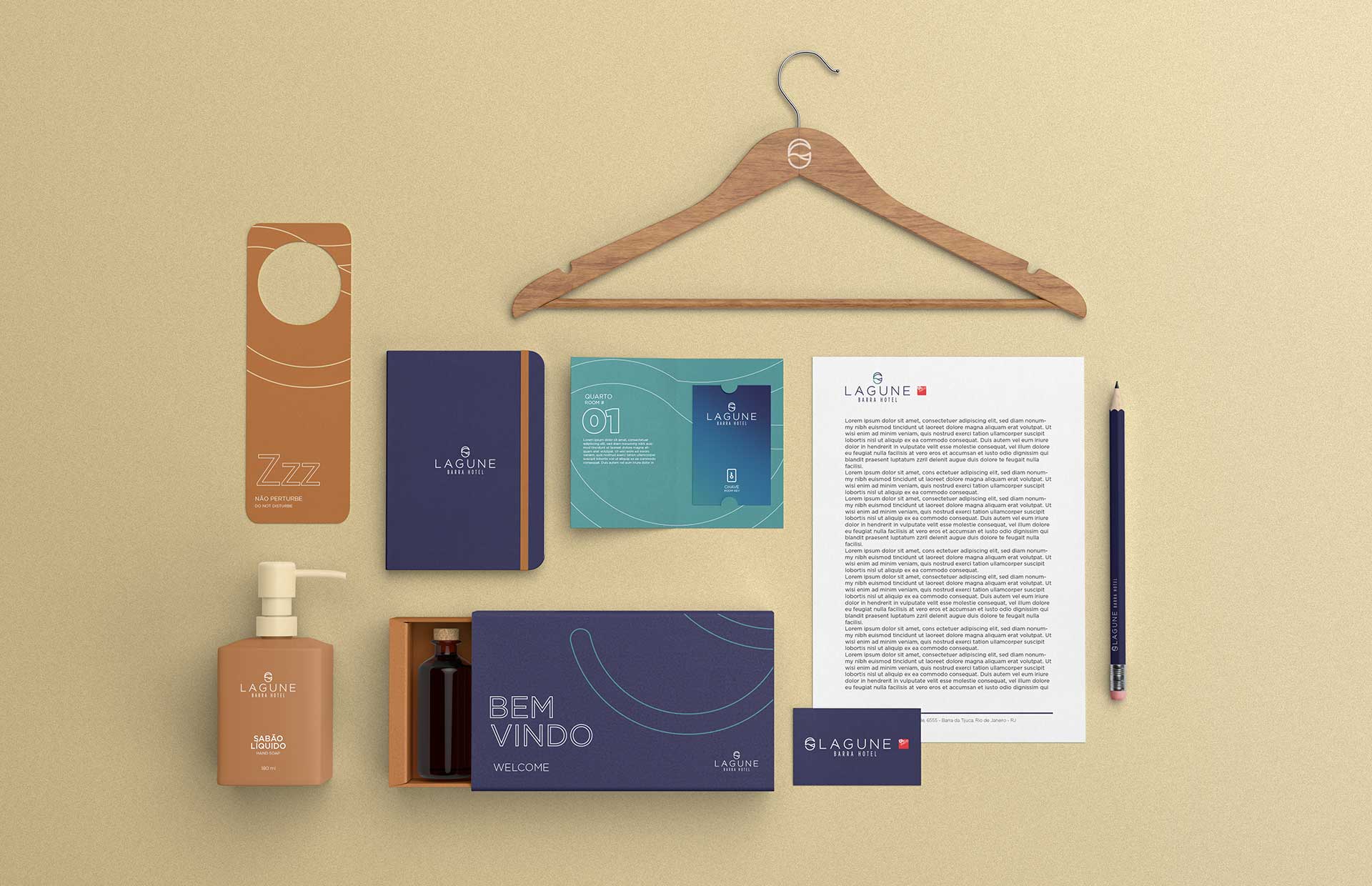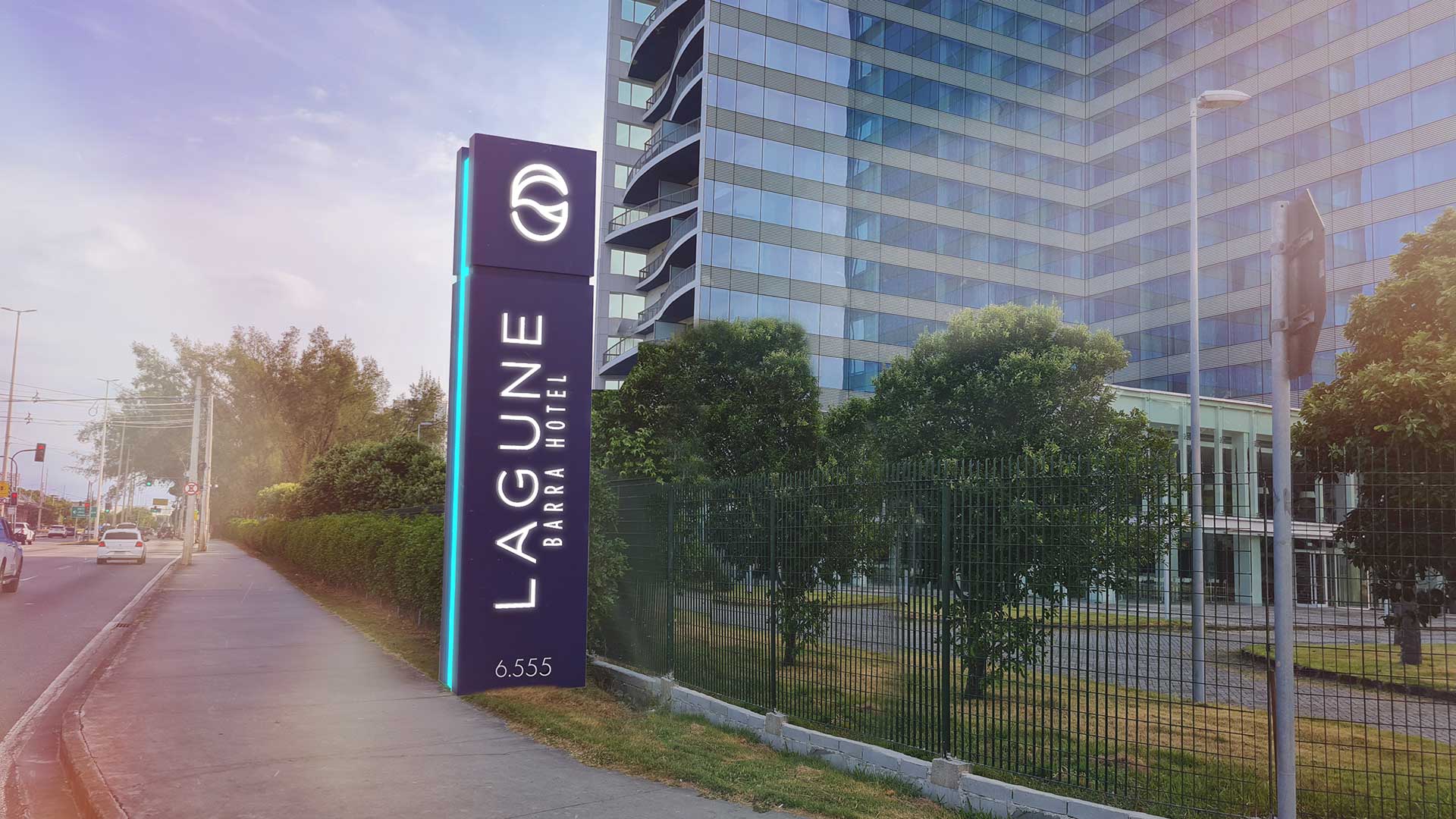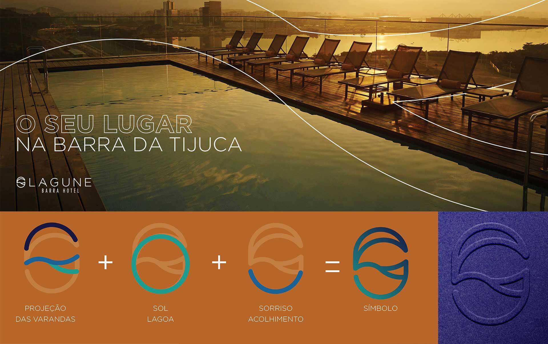 Desenvolvemos o projeto completo do Lagune Barra Hotel, localizado na Barra da Tijuca com vista panorâmica para a Lagoa de Jacarepaguá: naming, logo, identidade visual e sistema de sinalização.