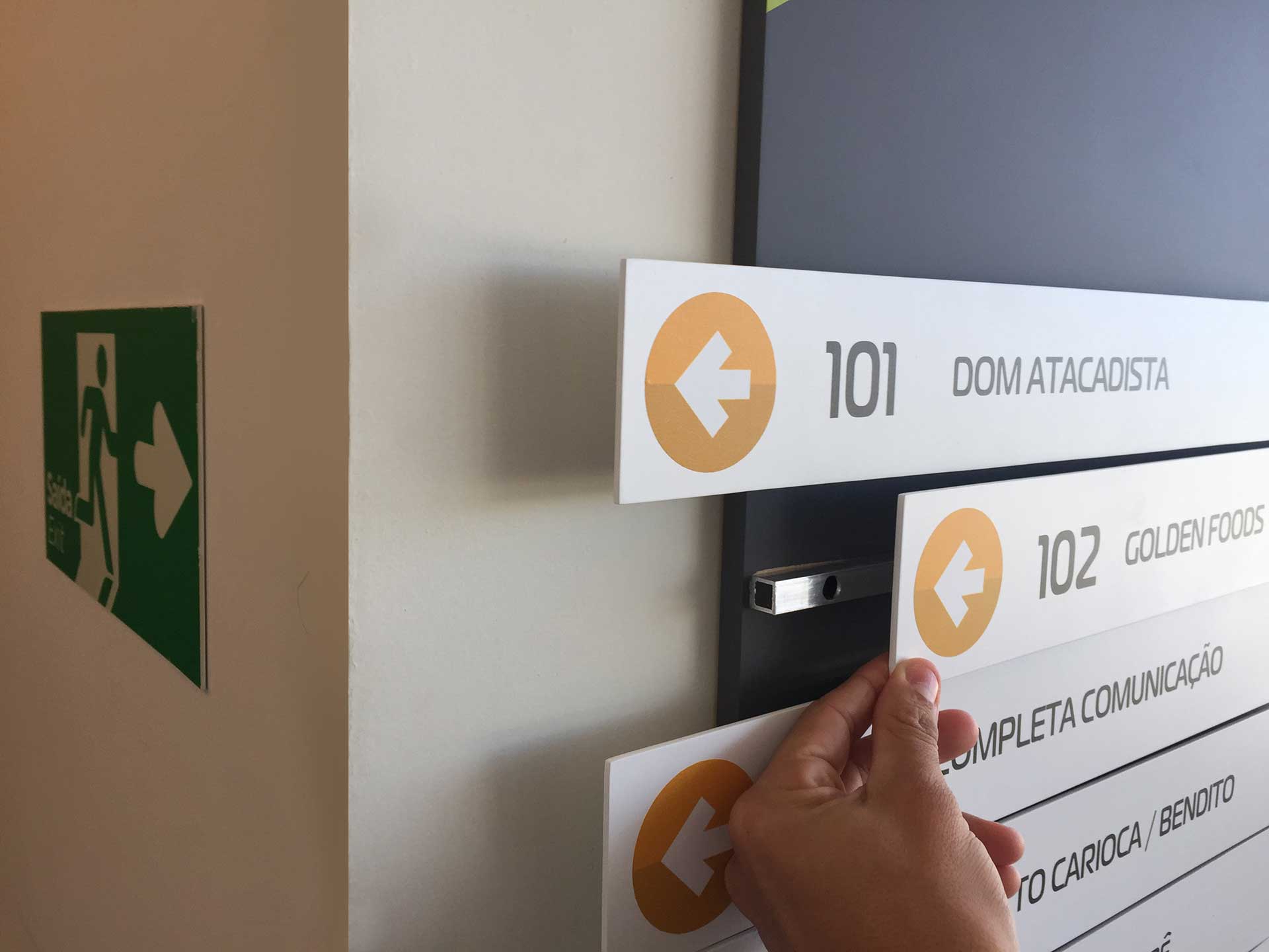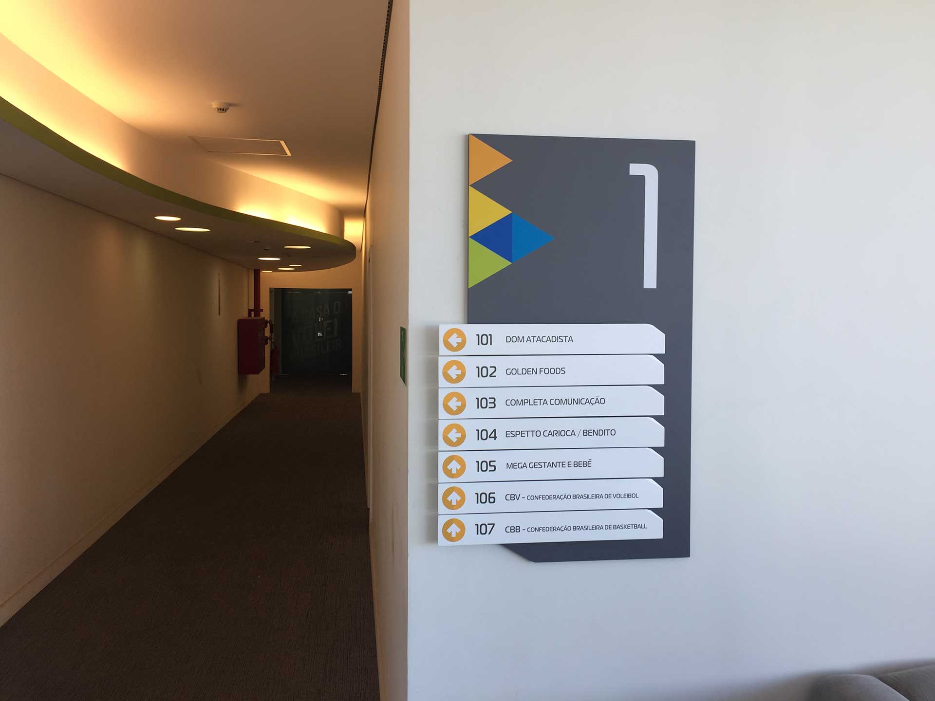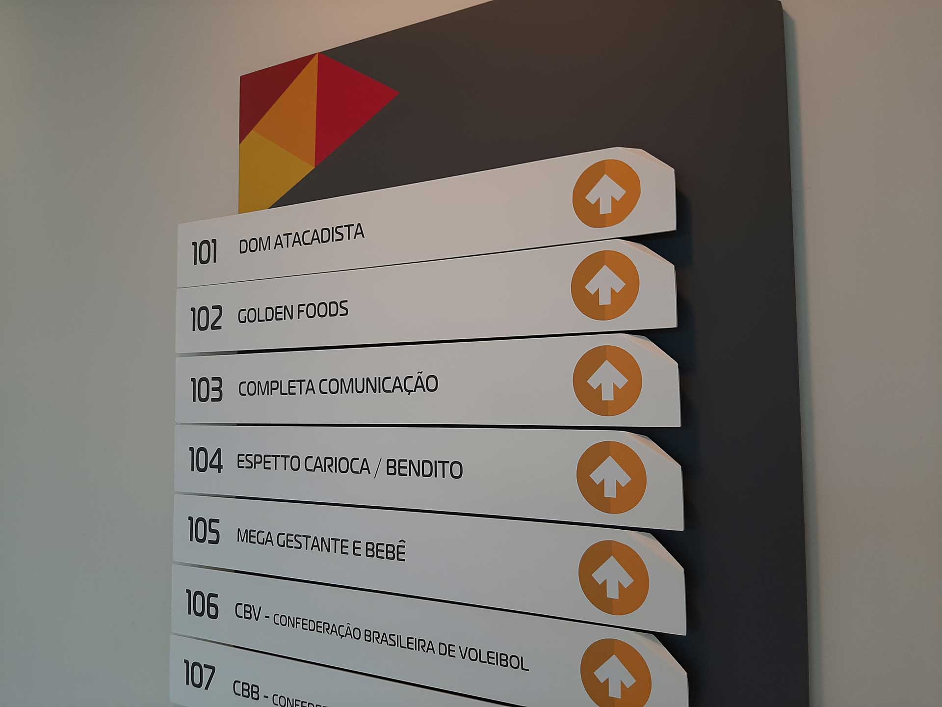 No hall de entrada, criamos intervenções que dão protagonismo ao logo e à identidade da marca, inserindo a sinalização principal de forma orgânica nesse contexto visual. O resultado é um ambiente que vai além da função orientativa: qualifica o espaço, fortalece a presença da marca e melhora a experiência de quem circula pelos escritórios.