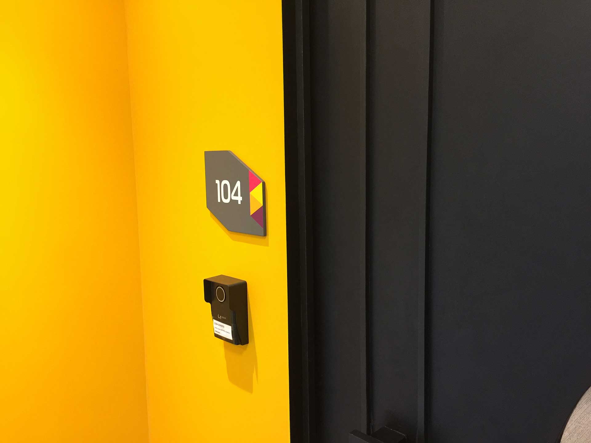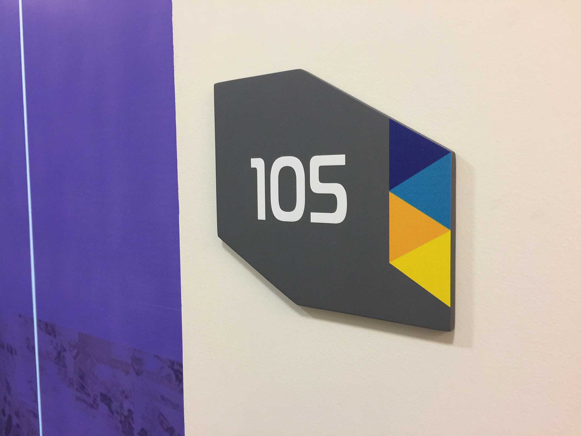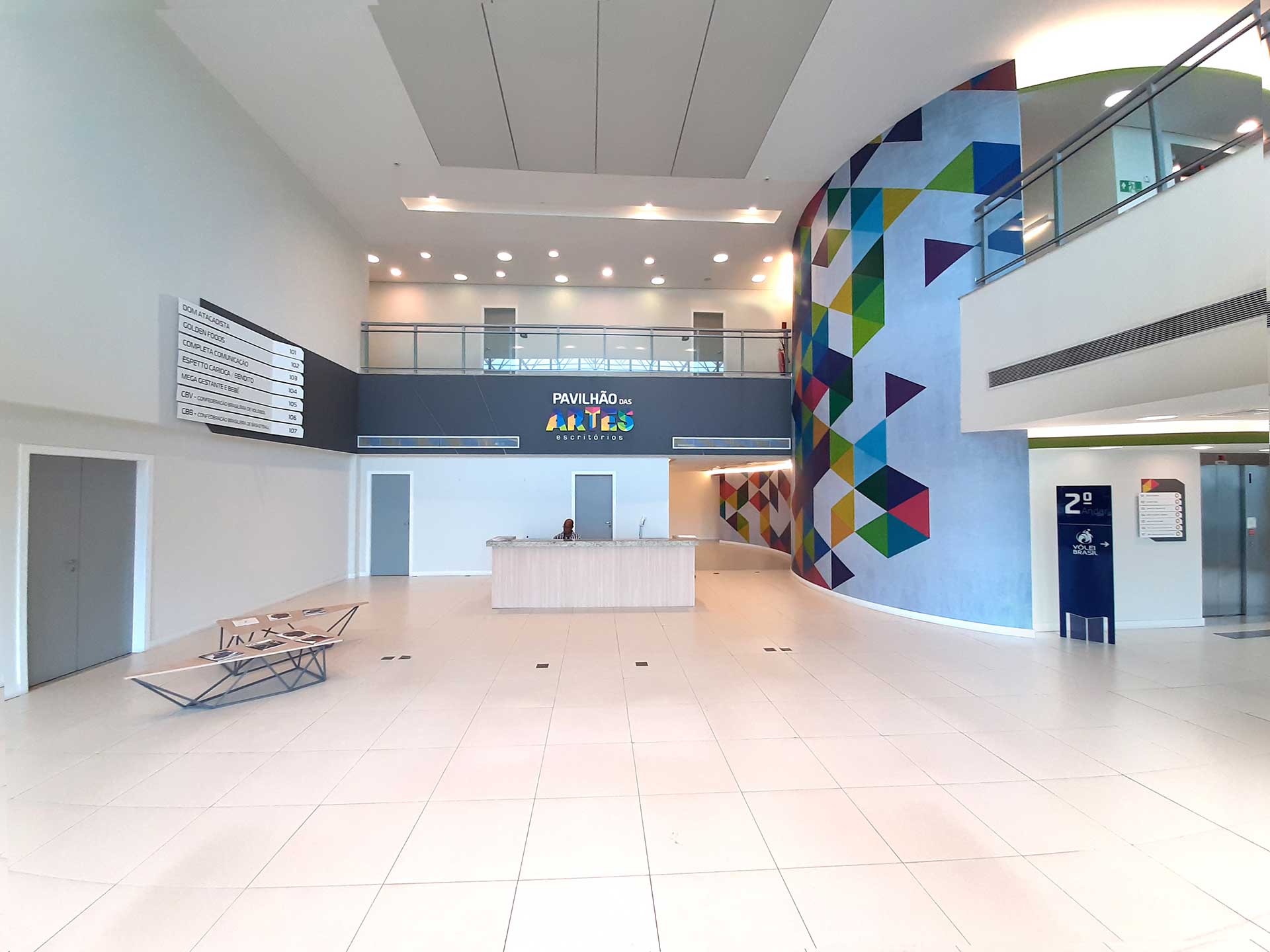 No hall de entrada, criamos intervenções que dão protagonismo ao logo e à identidade da marca, inserindo a sinalização principal de forma orgânica nesse contexto visual. O resultado é um ambiente que vai além da função orientativa: qualifica o espaço, fortalece a presença da marca e melhora a experiência de quem circula pelos escritórios.