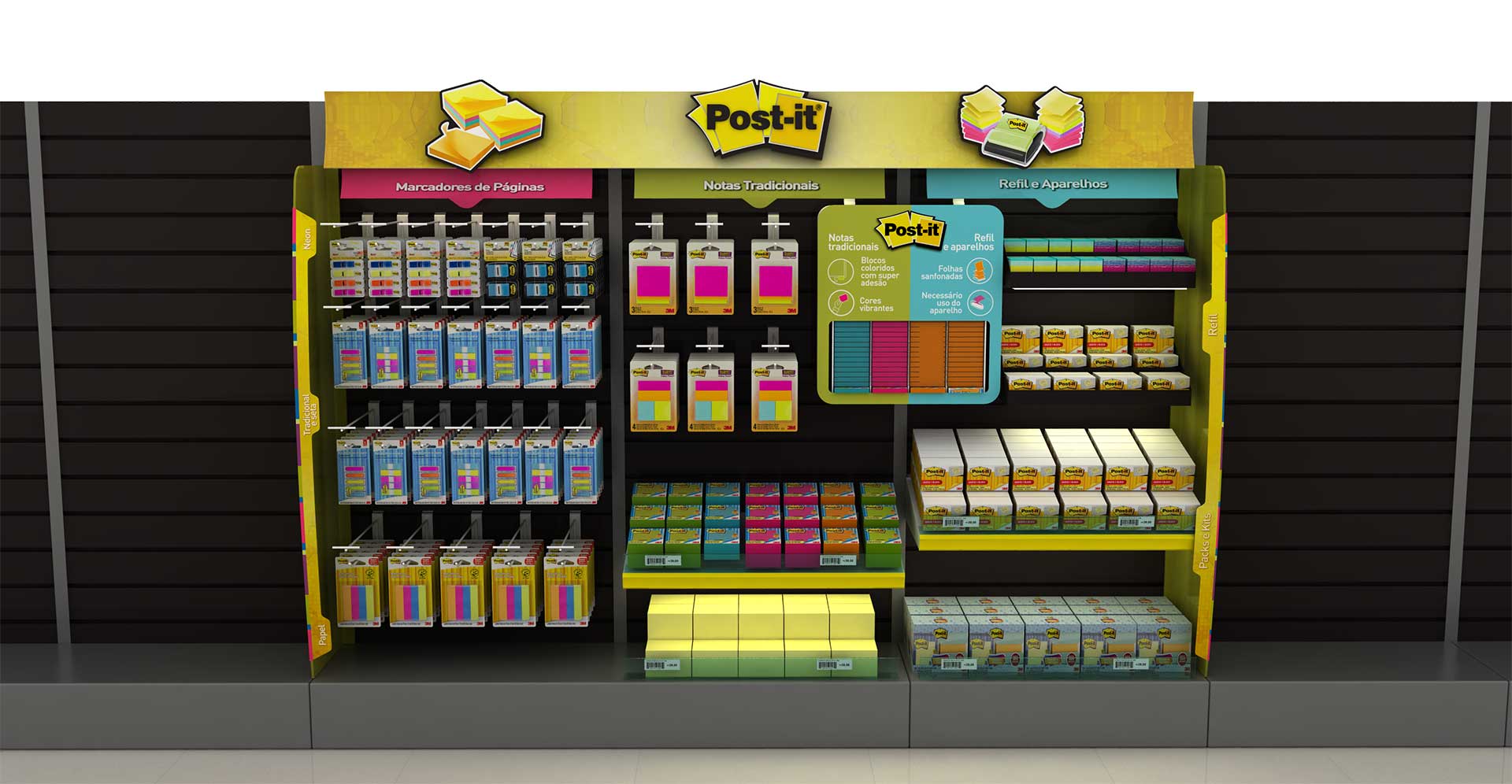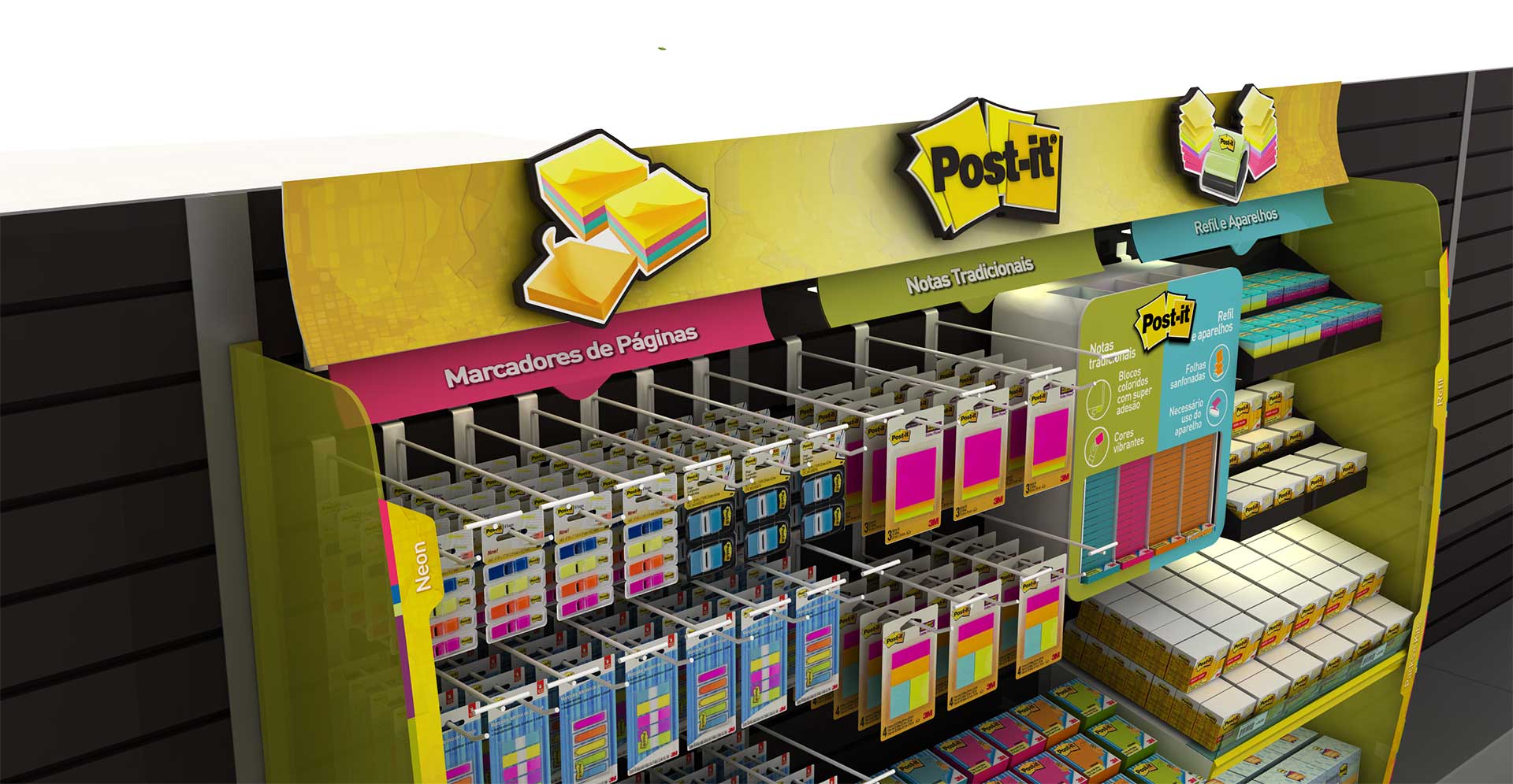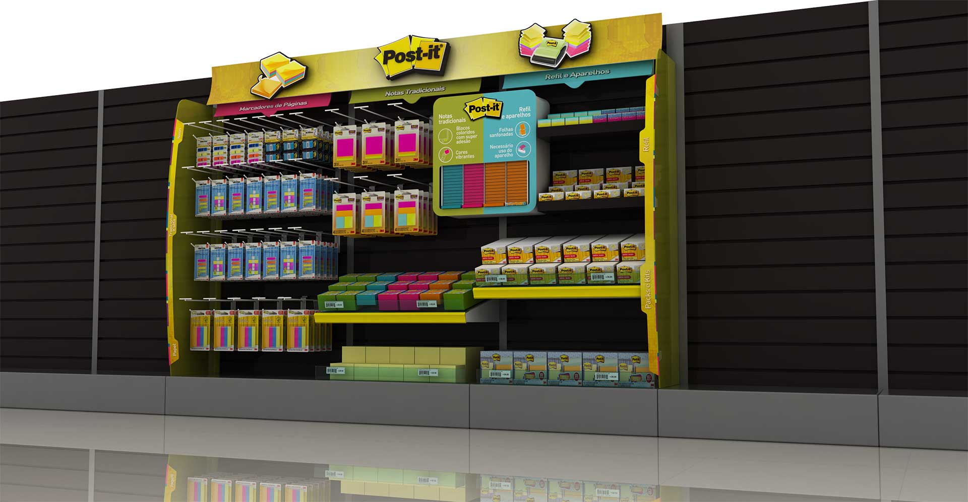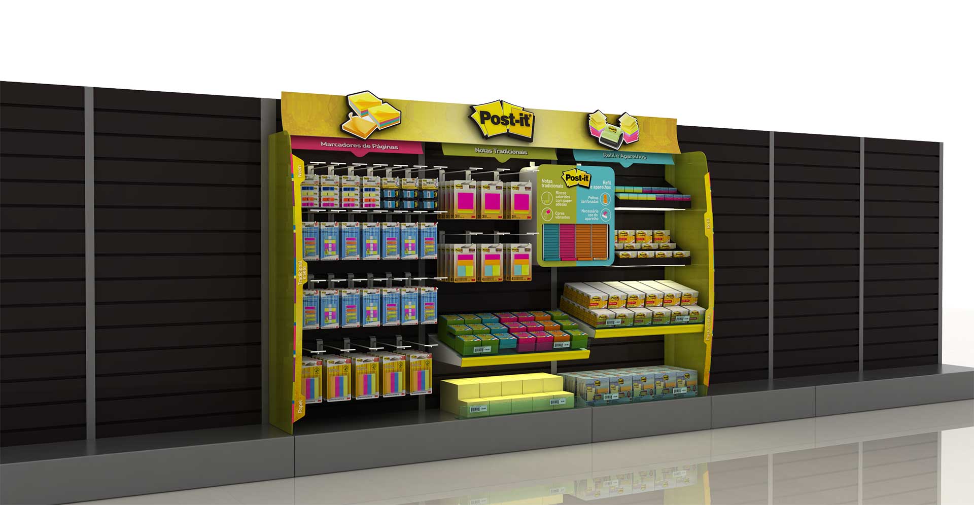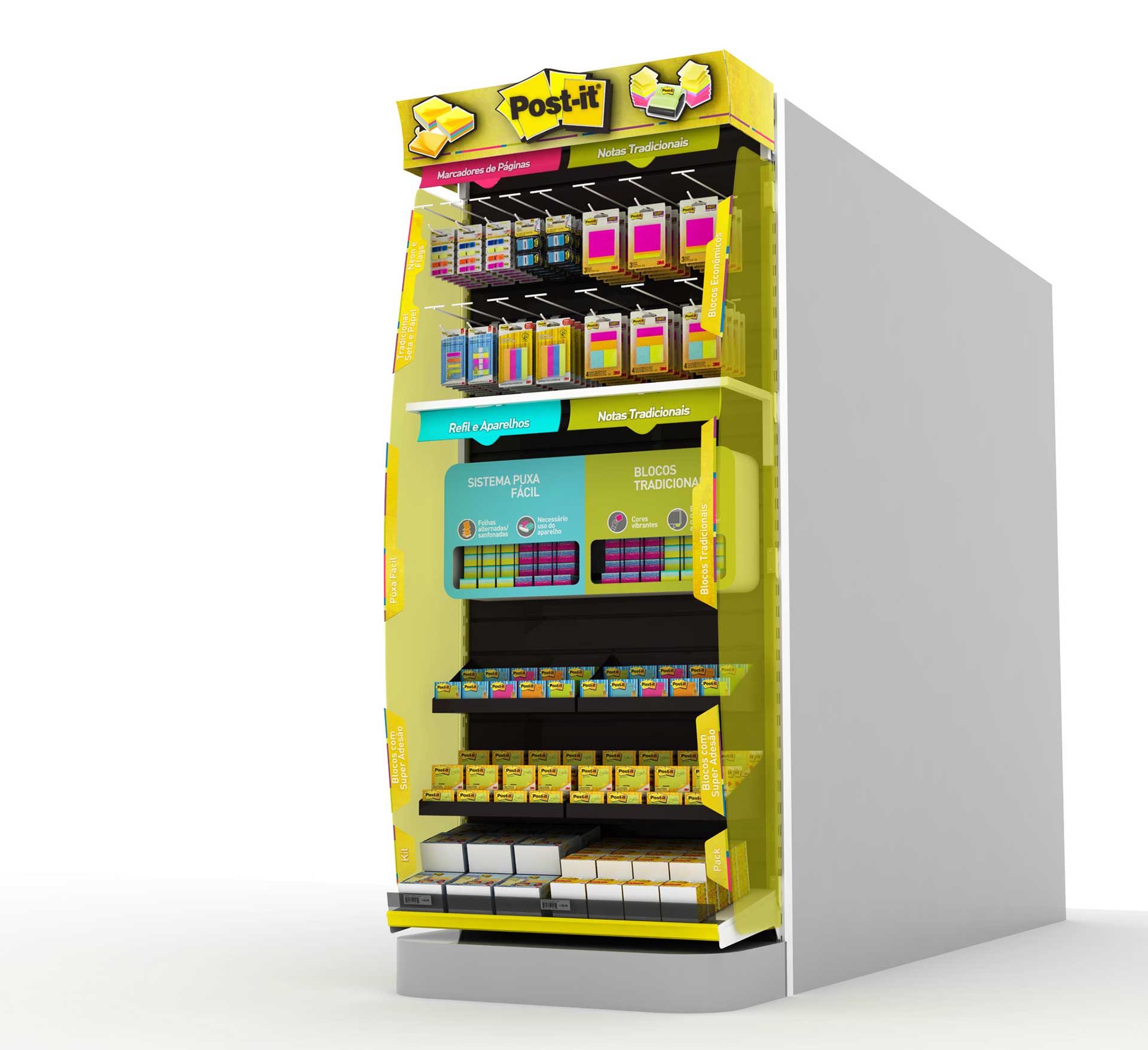 Desenvolvimento de PDV para a linha Post-it, com foco em impacto visual, organização por categoria e estímulo à compra por conveniência. O projeto explora o forte apelo cromático da marca para criar uma exposição dinâmica e altamente reconhecível no ponto de venda.