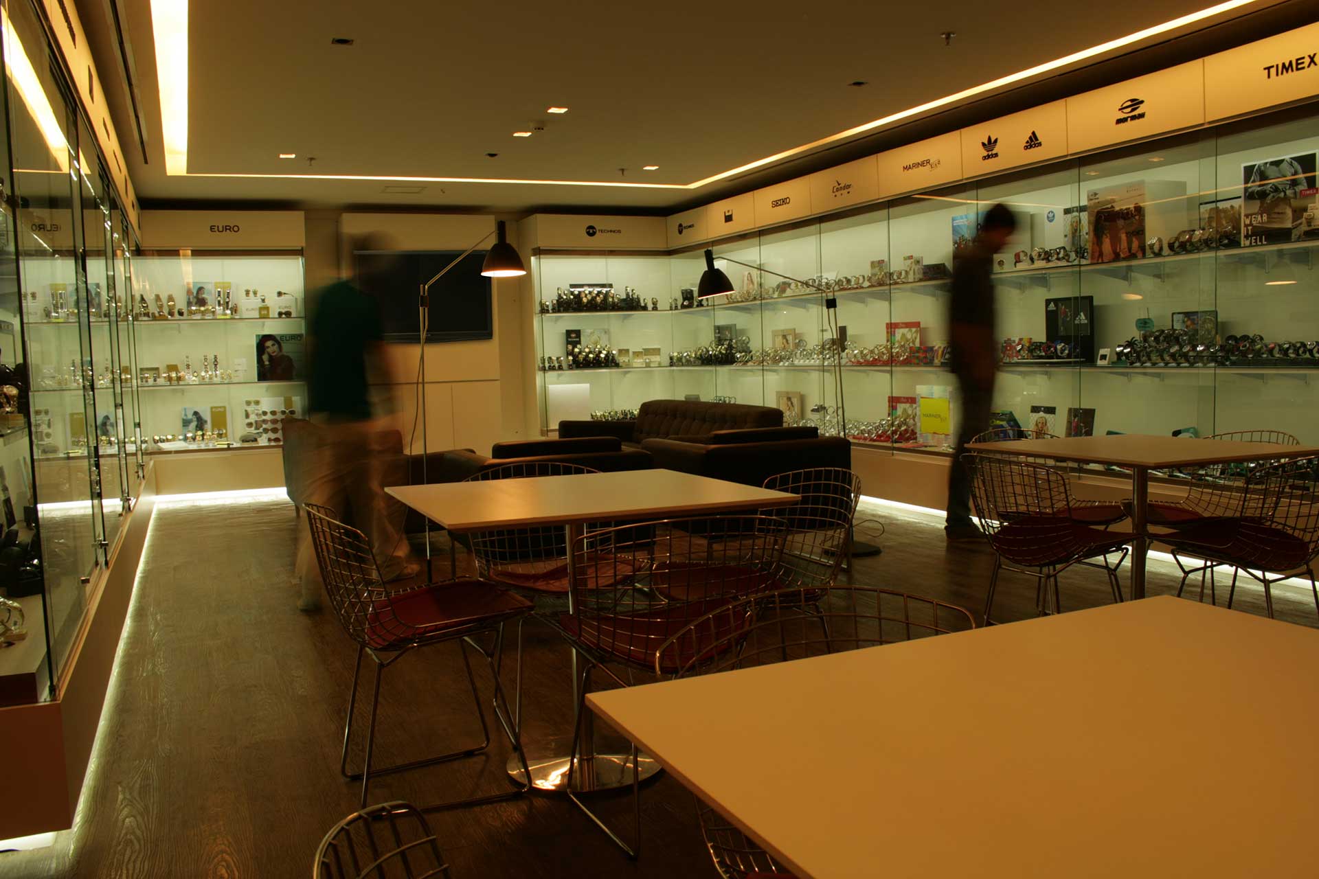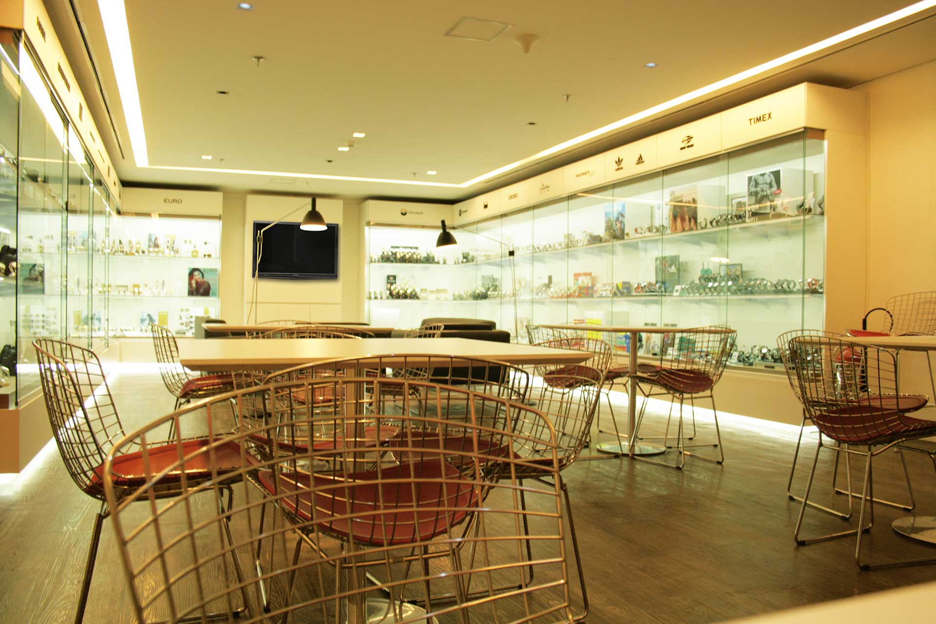 O ambiente combina linhas contemporâneas, iluminação indireta e mobiliário de estética leve para criar uma atmosfera sofisticada e acolhedora. As vitrines em vidro com iluminação embutida valorizam os produtos e organizam a exposição de forma clara e elegante, enquanto as mesas centrais incentivam interação, reuniões e momentos de troca.