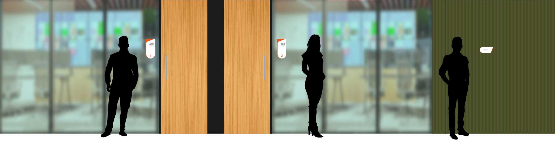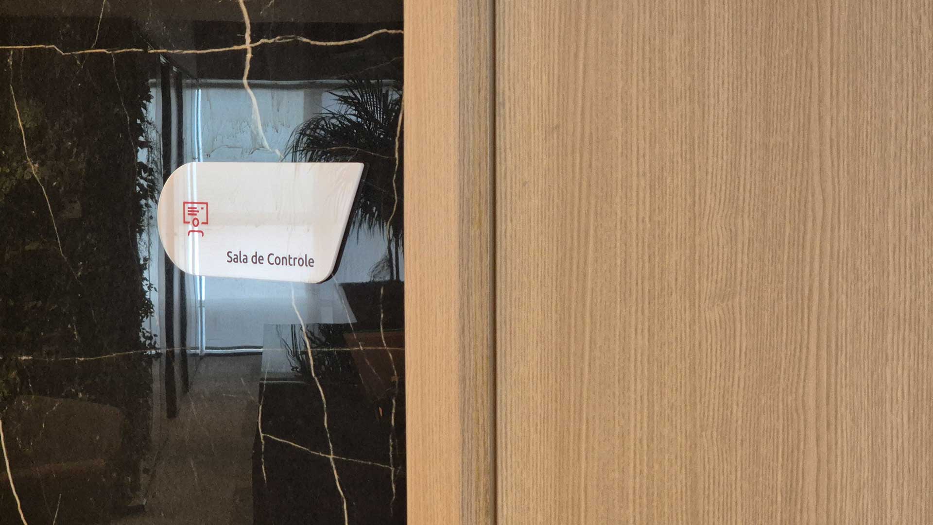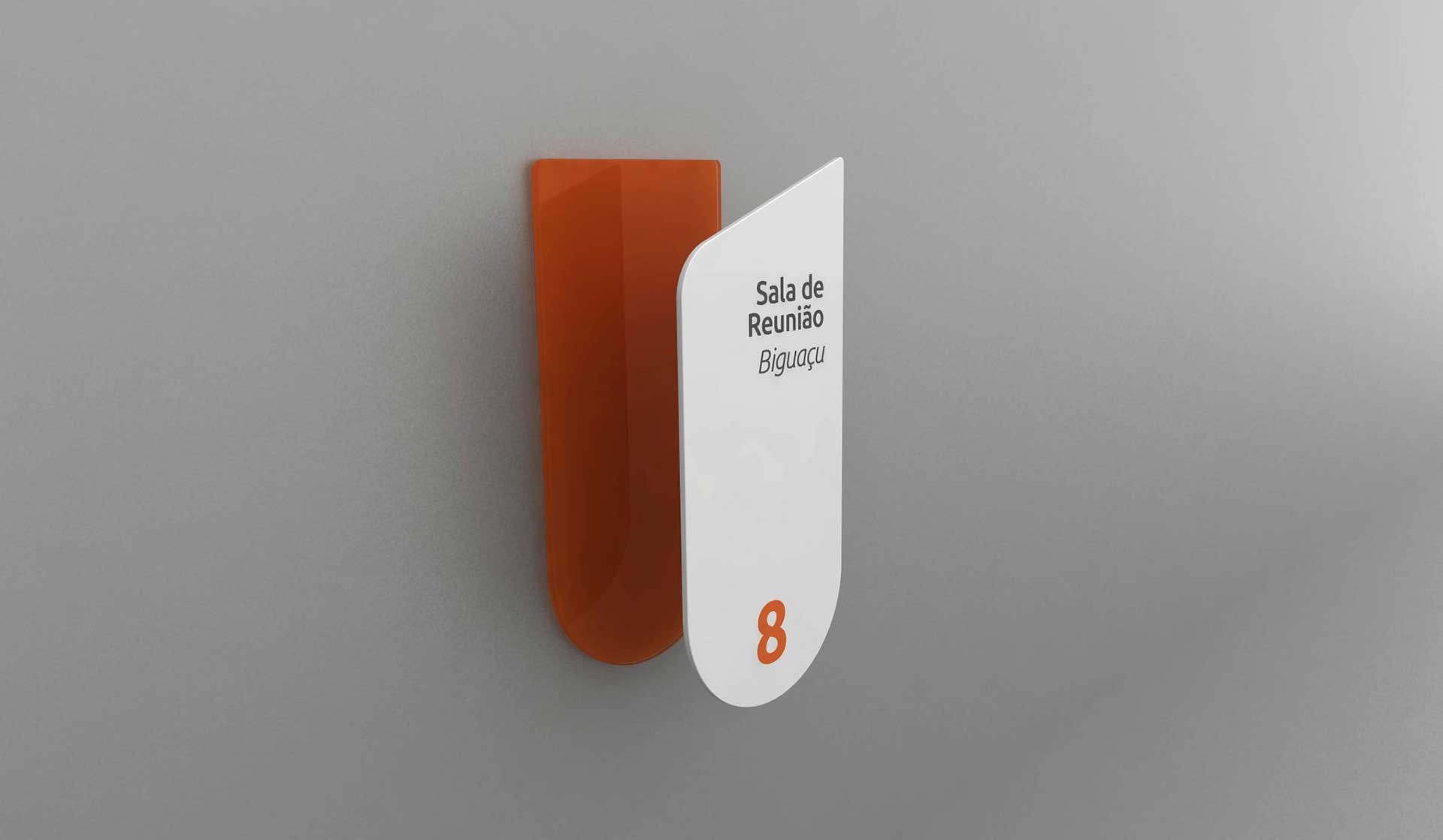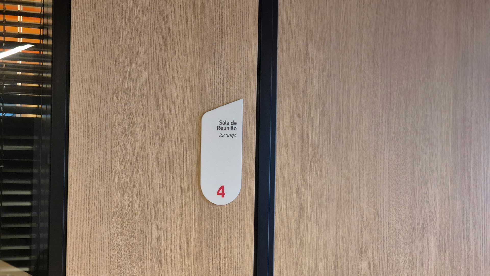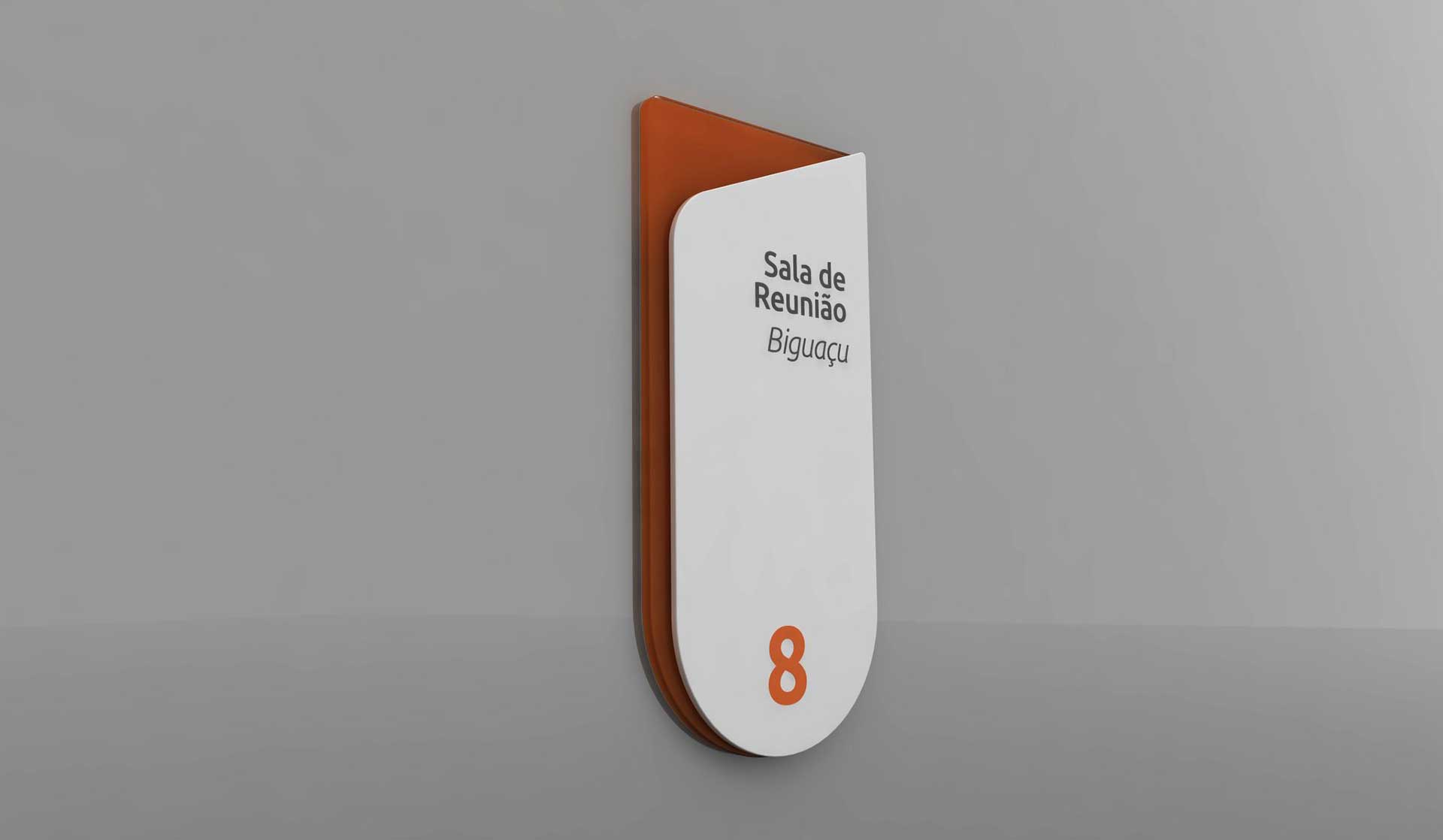 Projeto de sinalização desenvolvido para identificação de sala corporativa, com foco em clareza, hierarquia da informação e estética contemporânea.